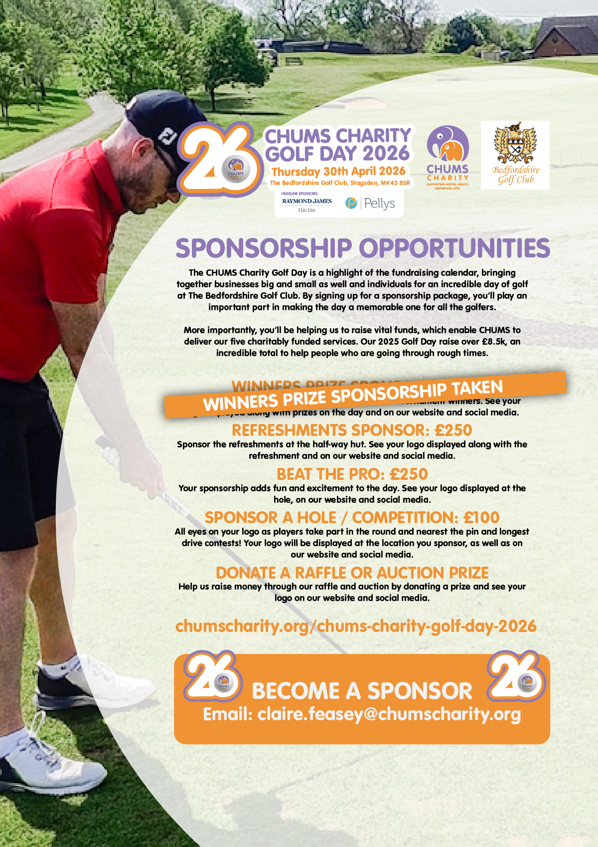 To register your interest as a player, sponsor, volunteer or to donate a raffle prize, please contact Claire Feasey by email on claire.feasey@chumscharity.org